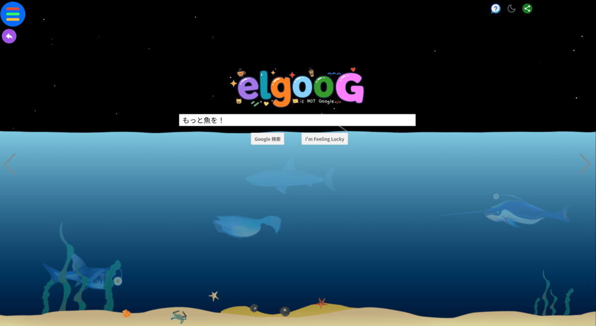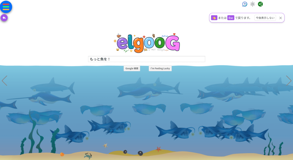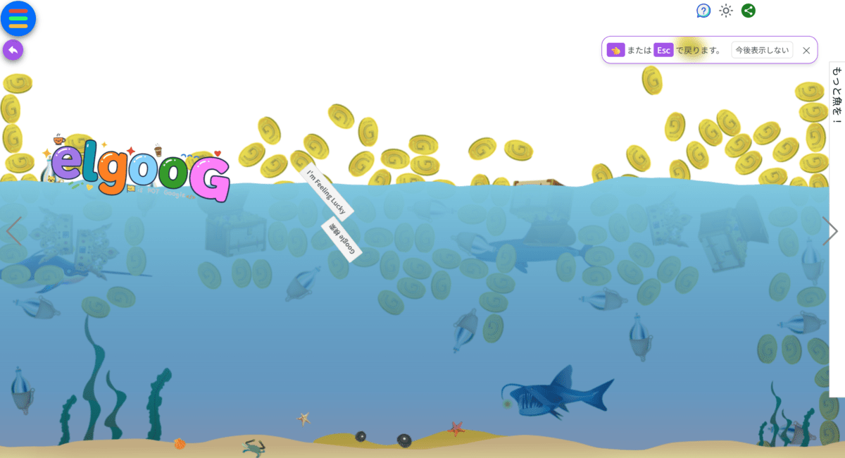 検索画面が海中に沈んで、たまに魚(サメ)が泳ぐだけ。