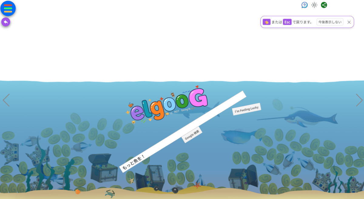 この画面になったあと、検索窓 or 水中のどこかをクリック(又はタップ)すれば沈みます。