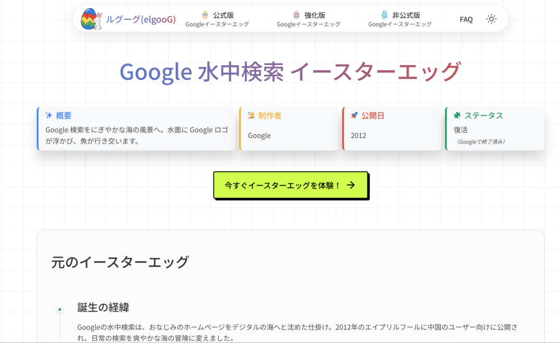 ↑ この画面になったら、緑ボックス「今すぐイースターエッグを体験!」をクリック。スマホならタップ。