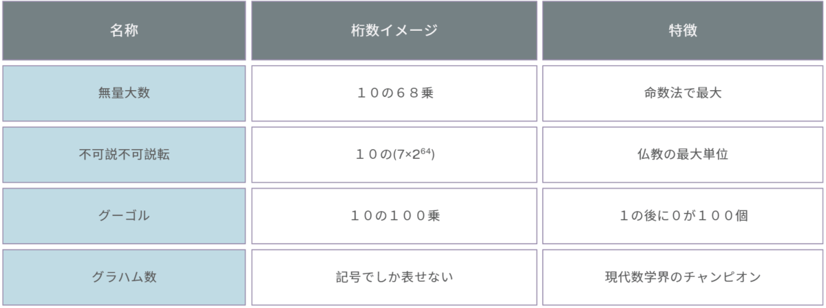 「宇宙の広さ」「時間の果てなさ」を表すために、「限界を超えた数」を定義していたのです。